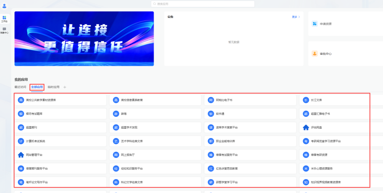5. 成功进入“WebVPN”页面后,点击“我的应用”栏目下的“全部应用”菜单,在“全部应用”菜单下的所有栏目均可访问,选择要打开的应用,点击进入相应系统,如图5。