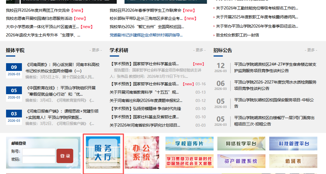 1. 进入平顶山学院主页(https://www.pdsu.edu.cn),选择“服务大厅”,如图1。