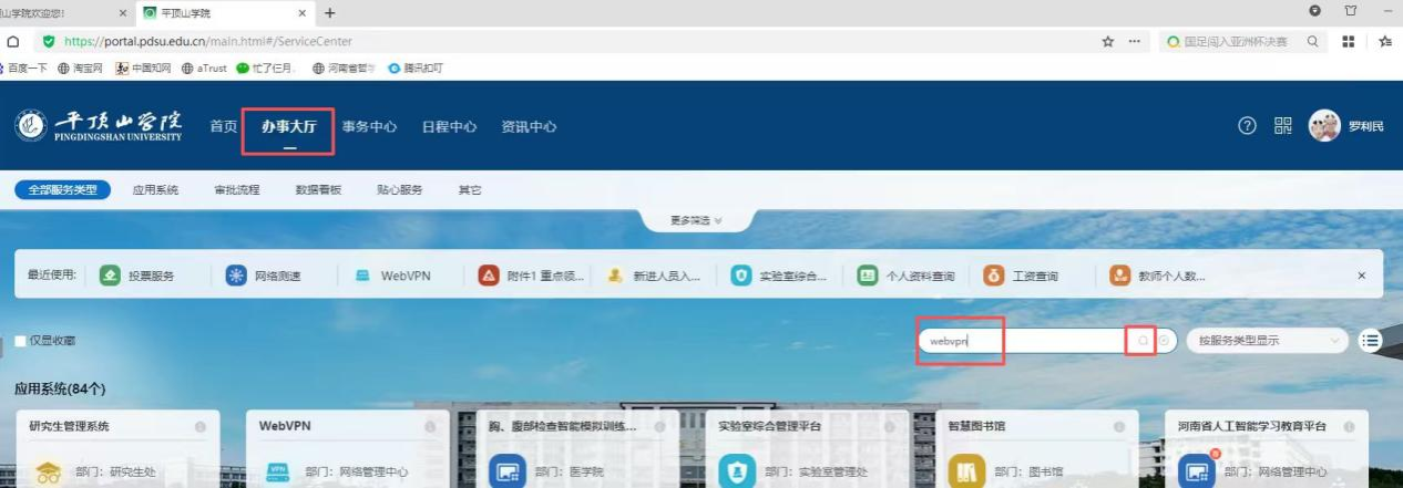 3. 登录成功后,点击“办事大厅”菜单,在搜索框输入“WebVPN”(不区分大小写),点击搜索图标,如图3。